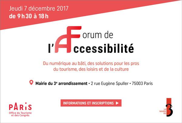 L’Office du Tourisme et des Congrès de Paris et la Mairie du 3e arrondissement de Paris ont le plaisir de vous convier au Forum de l’Accessibilité, jeudi 7 décembre de 9h30 à 18h.